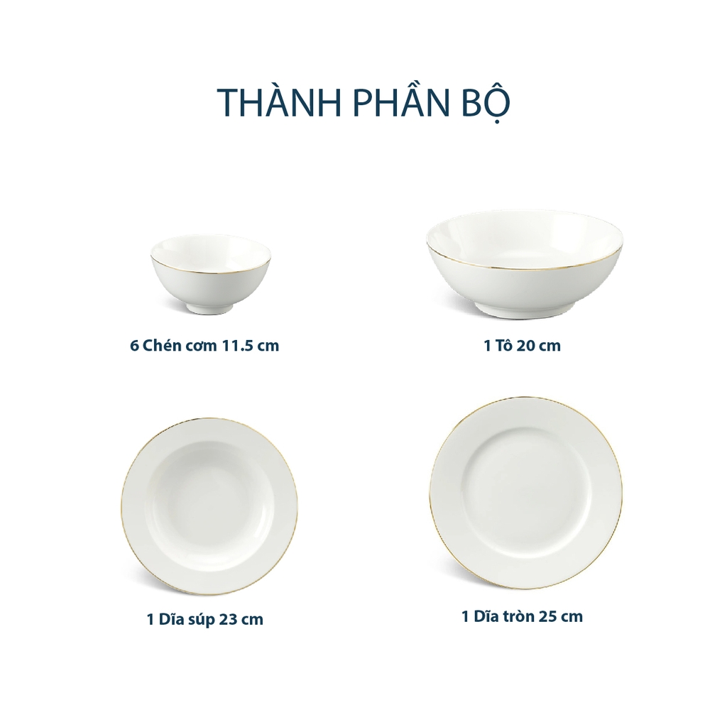 Bộ đồ ăn 09 sản phẩm – Jasmine – Viền Chỉ Vàng là sự lựa chọn lý tưởng cho người yêu thích phong cách sống tối giản nhưng vẫn sang trọng. Thiết kế viền chỉ vàng nổi bật trên nền sứ trắng cao cấp, tôn lên vẻ đẹp thanh lịch và đẳng cấp cho không gian bàn ăn. Phù hợp với cá nhân, cặp đôi, hoặc gia đình nhỏ.