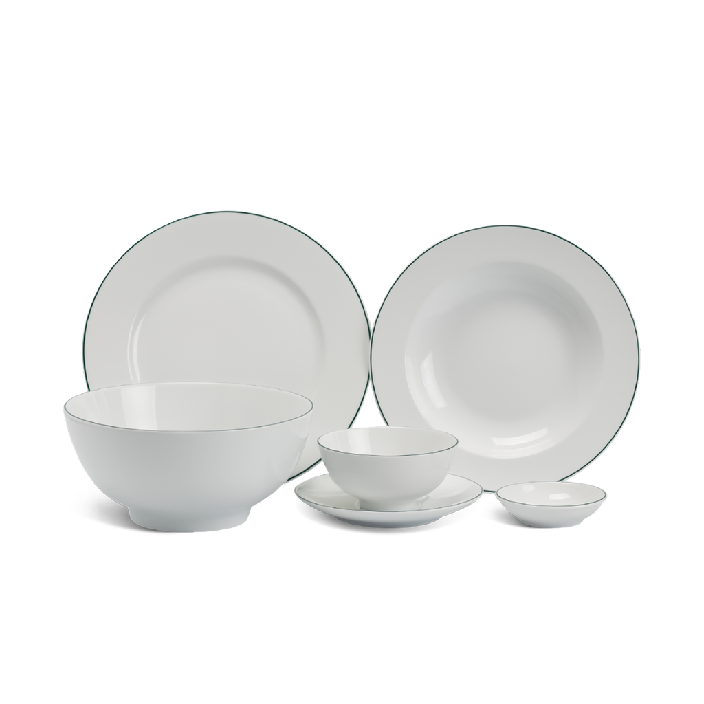 Thiết kế tinh tế, nhẹ nhàng với đường chỉ xanh lá thanh mảnh, tạo điểm nhấn nổi bật trên nền sứ trắng ngà sang trọng. Bộ sản phẩm bao gồm đầy đủ các món cần thiết cho bữa ăn gia đình hoặc tiếp khách, phù hợp sử dụng trong gia đình, nhà hàng, khách sạn cao cấp.