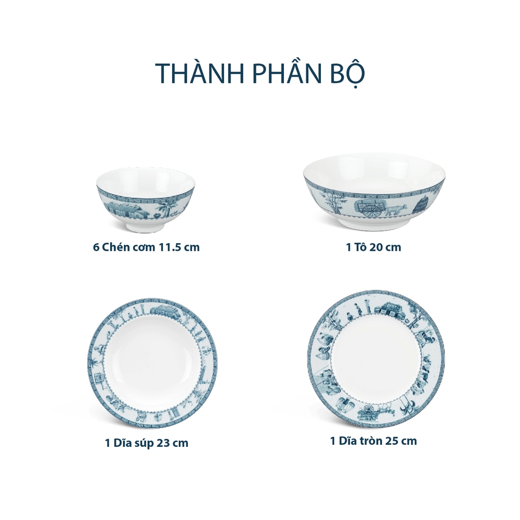 Bộ đồ ăn 9 sản phẩm – Jasmine – Thôn Dã mang phong cách thiết kế mộc mạc, giản dị nhưng đầy tinh tế, lấy cảm hứng từ khung cảnh làng quê Việt Nam thanh bình. Họa tiết được thể hiện bằng nét vẽ nhẹ nhàng trên nền sứ trắng ngà, kết hợp cùng bố cục tối giản, tạo cảm giác gần gũi, thư thái khi dùng bữa.
