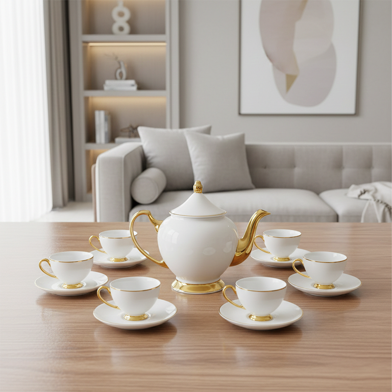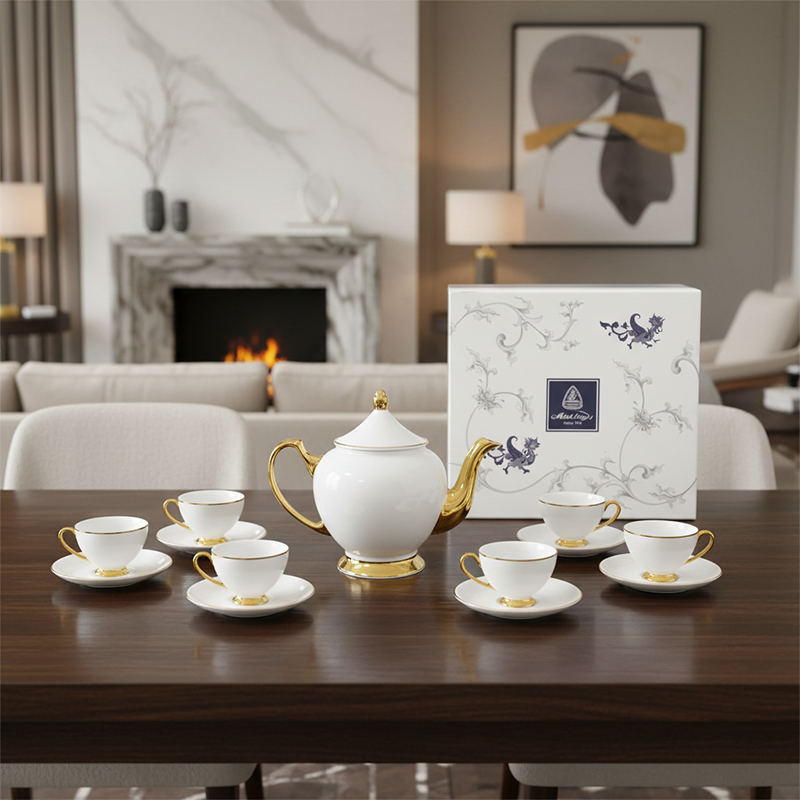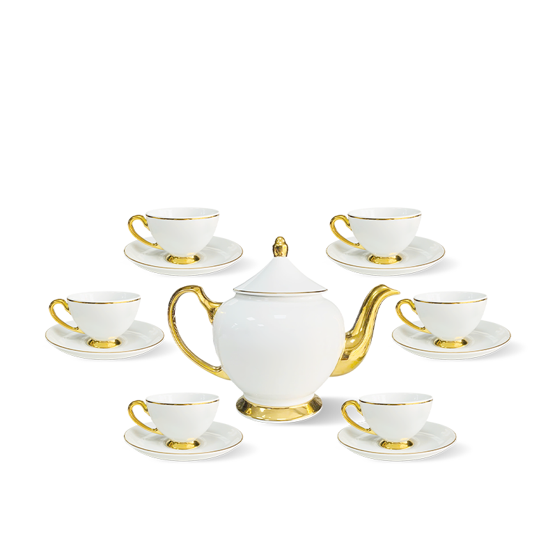 Bộ trà 0.65L – Hoàng Cung – Chỉ Vàng là biểu tượng của vẻ đẹp truyền thống kết hợp tinh xảo cùng nghệ thuật chế tác sứ cao cấp. Dáng trà Hoàng Cung cổ điển được viền chỉ vàng sang trọng, tôn lên vẻ quyền quý và thanh lịch cho không gian trà Việt. Sản phẩm không chỉ là vật dụng thưởng trà mà còn là món quà đầy ý nghĩa cho những dịp quan trọng như tân gia, mừng thọ, lễ Tết.