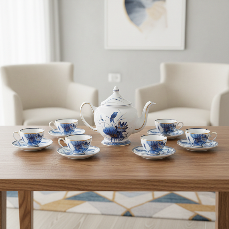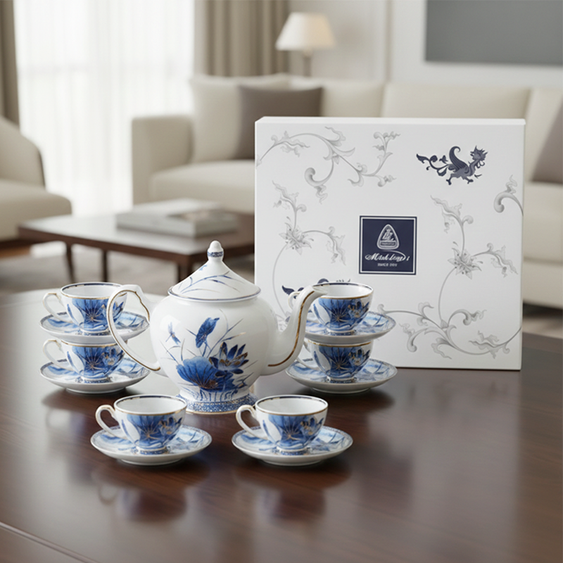 Bộ trà 0.65L – Hoàng Cung – Sen Vàng là hiện thân của vẻ đẹp cao quý, kết tinh từ nghệ thuật gốm sứ đỉnh cao và tinh thần văn hóa Việt. Họa tiết hoa sen vàng được vẽ tay tỉ mỉ trên nền men ngọc thanh thoát, thể hiện sự thanh cao, thuần khiết và trường tồn. Dáng trà Hoàng Cung thanh lịch cùng chất sứ ngọc cao cấp mang lại trải nghiệm thưởng trà sang trọng, tinh tế trong từng khoảnh khắc.
