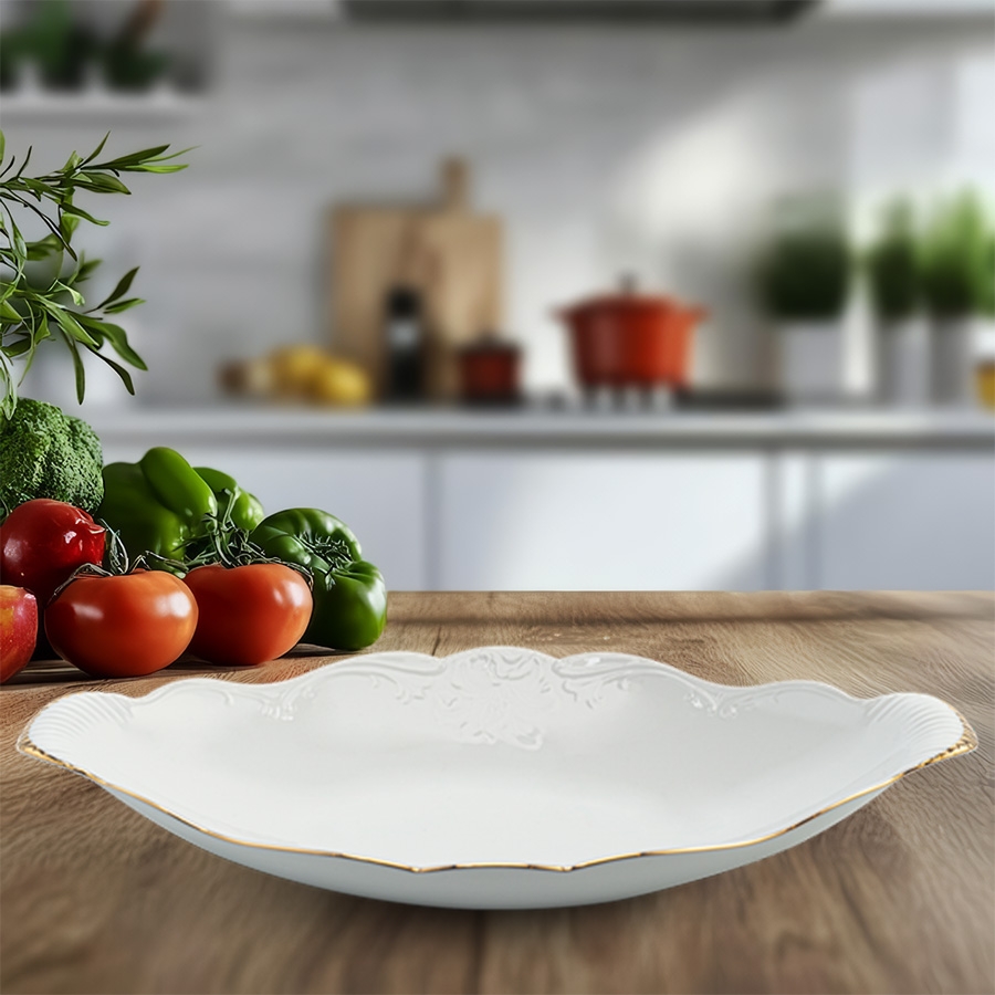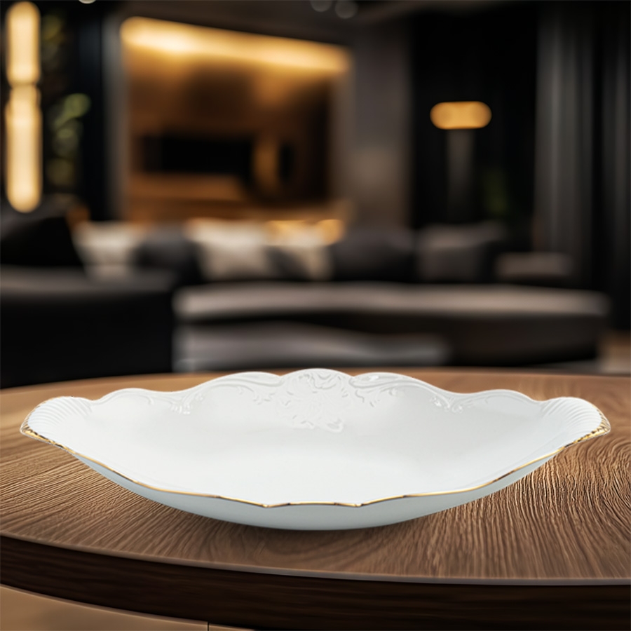 Sản phẩm được chế tác từ sứ trắng chất lượng cao, nung ở nhiệt độ cao giúp tăng độ bền, khó trầy xước và an toàn khi tiếp xúc thực phẩm. Họa tiết Đài Các lấy cảm hứng từ vẻ đẹp cung đình truyền thống, kết hợp cùng đường viền chỉ vàng tạo nên điểm nhấn nổi bật, phù hợp dùng trong các bữa tiệc, nhà hàng cao cấp hoặc làm quà tặng sang trọng.