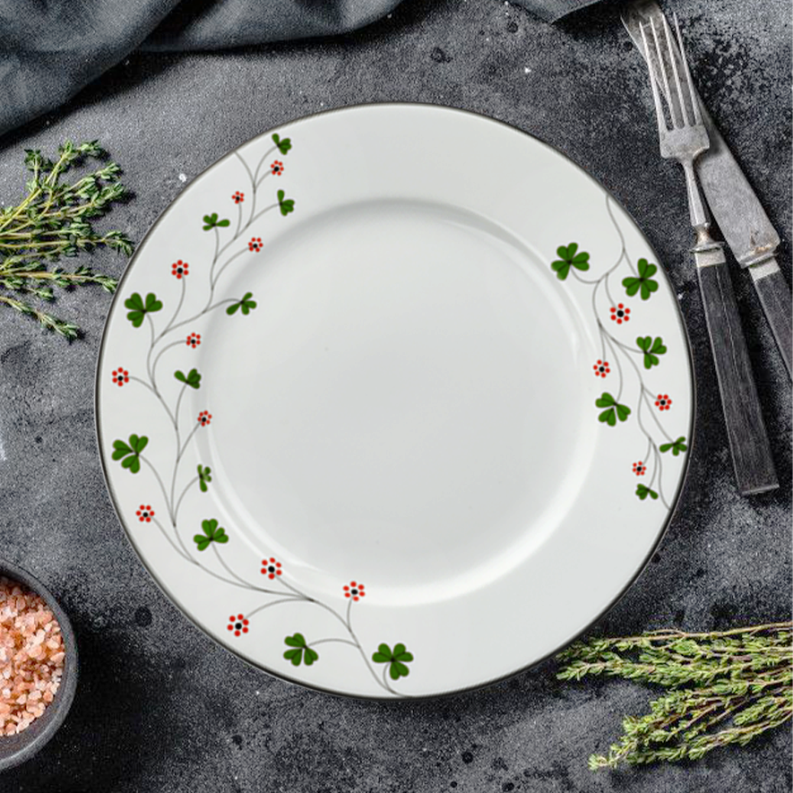 Họa tiết hoa may mắn được thiết kế trang nhã, phối màu nhẹ nhàng trên nền men trắng, mang lại cảm giác thanh bình, thu hút tài lộc và năng lượng tích cực cho bàn ăn.