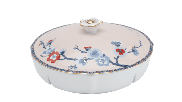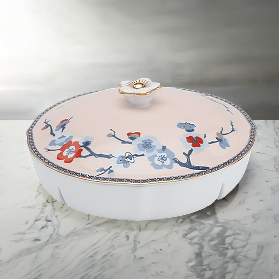 Khay mứt 5 ngăn - Hoa Đào Thịnh Vượng là sản phẩm tinh tế thuộc dòng gốm sứ cao cấp của Minh Long I, mang đậm hơi thở mùa xuân và văn hóa Tết Việt. Với thiết kế gồm 5 ngăn riêng biệt, chiếc khay giúp bạn trình bày mứt, bánh, hạt khô một cách gọn gàng, sang trọng – vừa tiện lợi, vừa đẹp mắt.