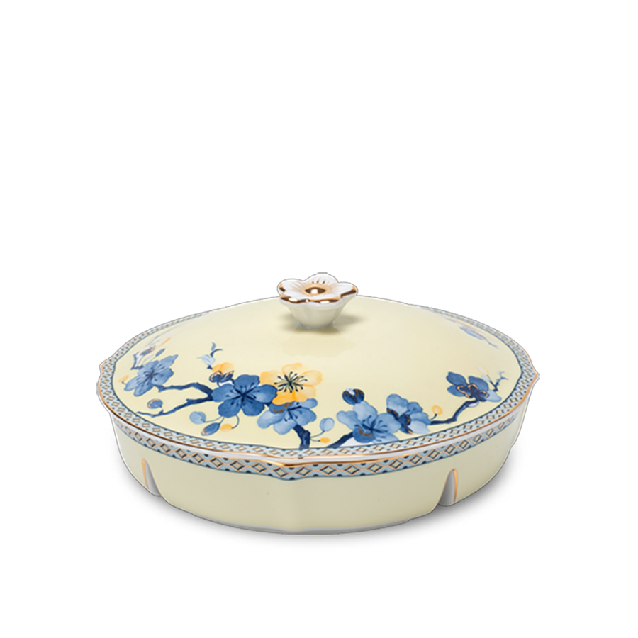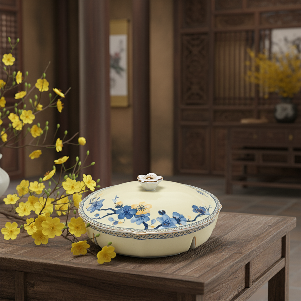 Nắp đậy hoa văn nổi: Tay cầm hình bông mai mạ vàng nổi bật, giúp dễ thao tác và tô điểm cho tổng thể sản phẩm.