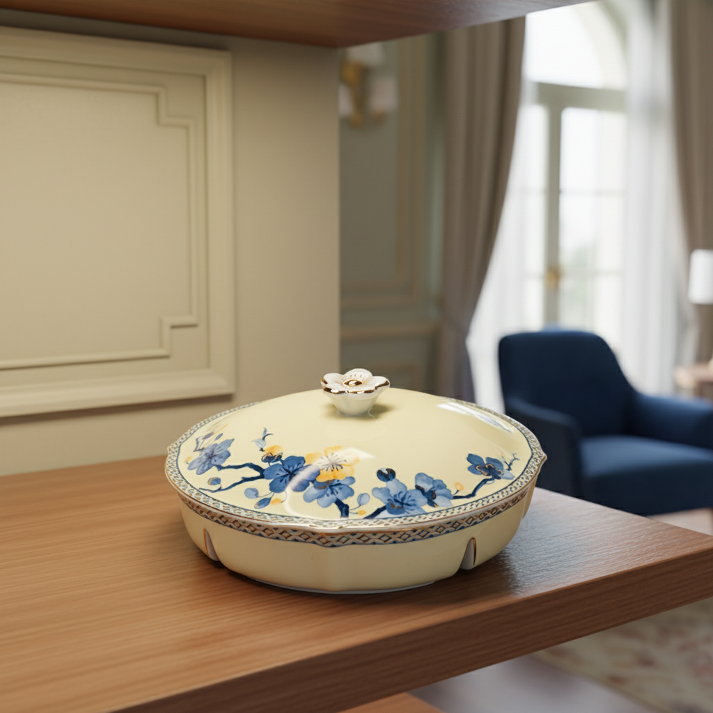 Bộ khay mứt 5 ngăn - Hoa Mai Phú Quý (viền vàng) là biểu tượng của may mắn, tài lộc và thịnh vượng trong dịp Tết. Thiết kế tinh xảo với sắc vàng nhã nhặn kết hợp họa tiết hoa mai xanh mang ý nghĩa an khang – sung túc, cùng đường viền vàng ánh kim sang trọng, thể hiện đẳng cấp và gu thẩm mỹ tinh tế của gia chủ.