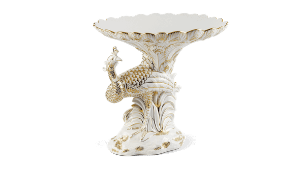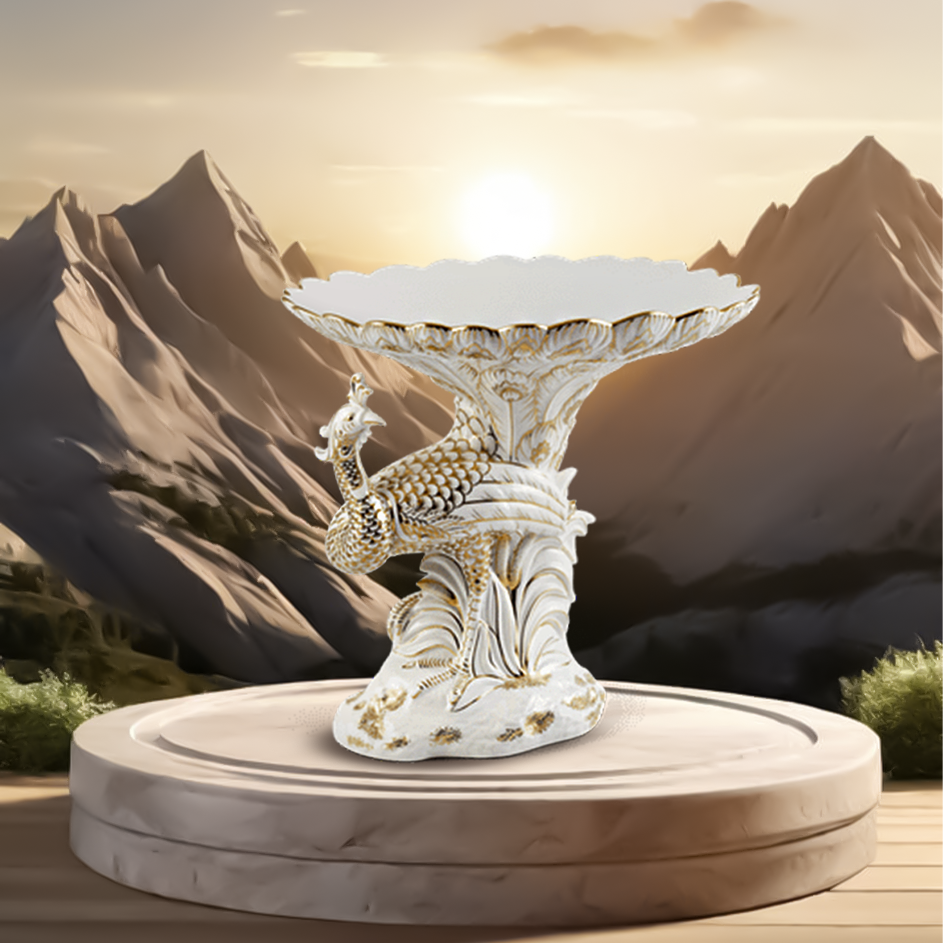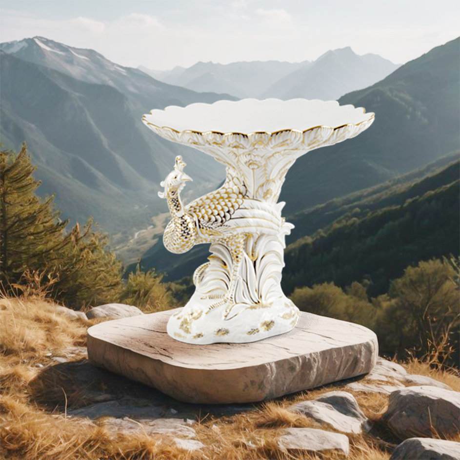 TÔ TRÁI CÂY KHỔNG TƯỚC (DÁNG ĐỨNG – BÊN PHẢI) – VẼ TAY – TRẮNG – TRANG TRÍ VÀNG | MINH LONG I