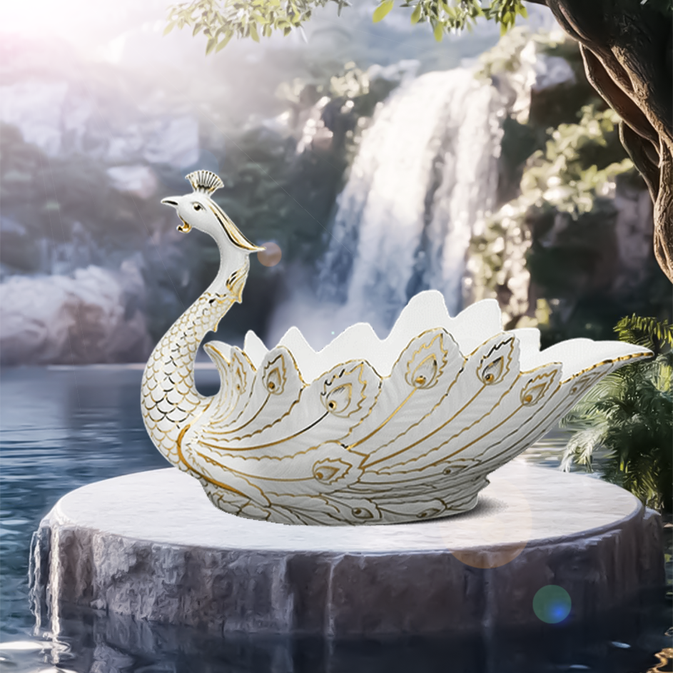 Tạo hình chim khổng tước duyên dáng, thân mềm mại, đuôi lượn sóng, ôm trọn lòng tô sâu rộng – không chỉ lý tưởng để đựng trái cây mà còn mang ý nghĩa gìn giữ lộc xuân, lan tỏa năng lượng tích cực cho không gian thờ cúng hoặc bàn tiệc. Mỗi đường nét được vẽ tay khéo léo, điểm xuyết vàng 24K lấp lánh, tạo nên một tác phẩm vừa vững chãi vừa uyển chuyển.